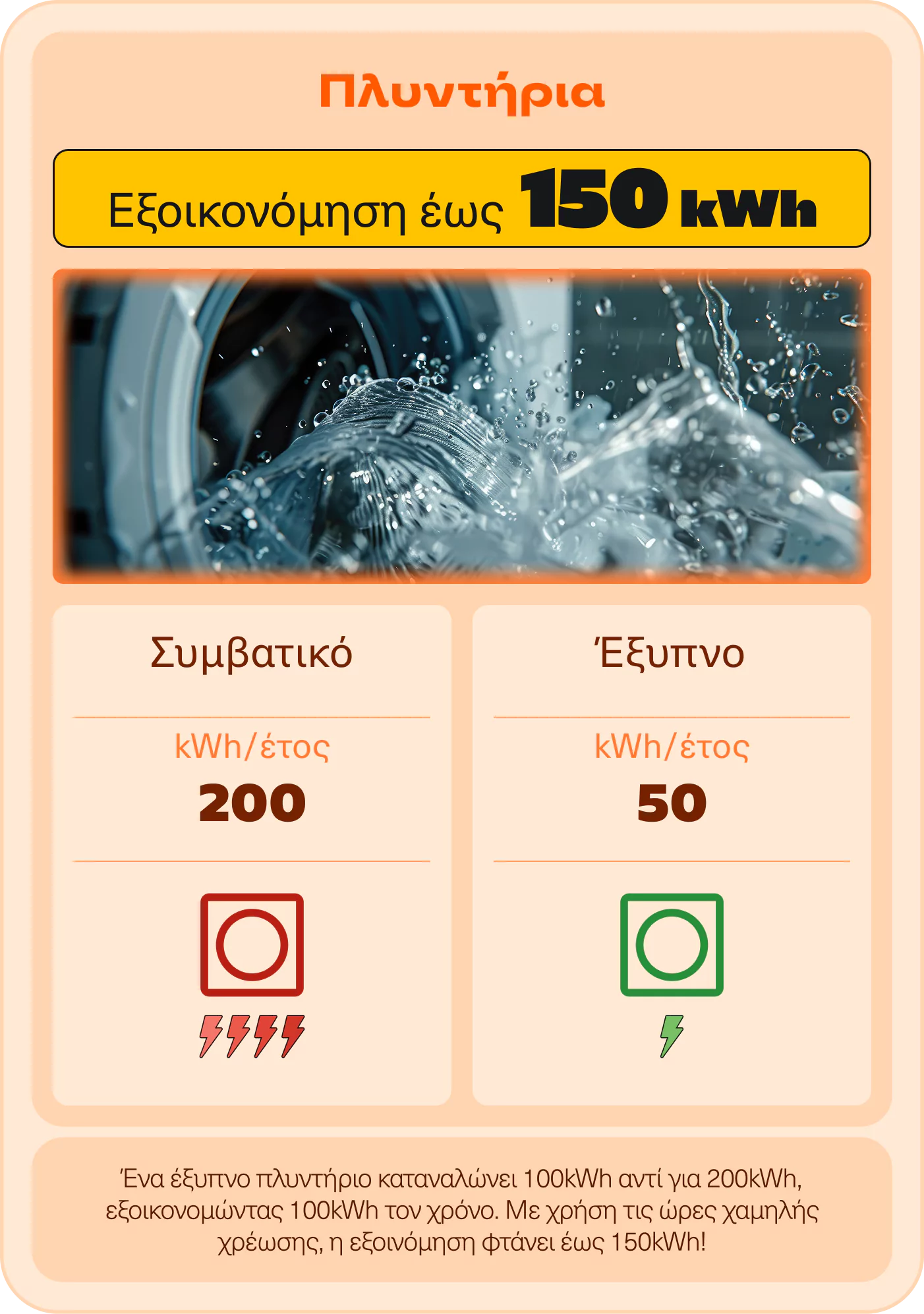 Οι έξυπνες συσκευές προσαρμόζουν τη λειτουργία τους αυτόματα, μειώνοντας έτσι την κατανάλωση ενέργειας. Παράλληλα, σου δίνουν τη δυνατότητα να τις προγραμματίζεις ώστε να λειτουργούν τις ώρες που το ρεύμα είναι φθηνότερο, εξασφαλίζοντας ακόμα μεγαλύτερη εξοικονόμηση. Δεδομένου ότι ένα μέσο νοικοκυριό καταναλώνει περίπου 3.500-4.500 kWh ετησίως, η συνολική εξοικονόμηση μπορεί να φτάσει έως και 1.050 kWh ετησίως.