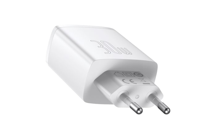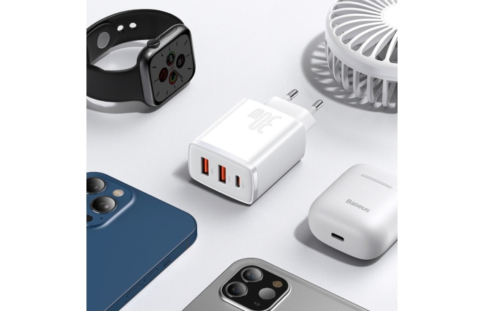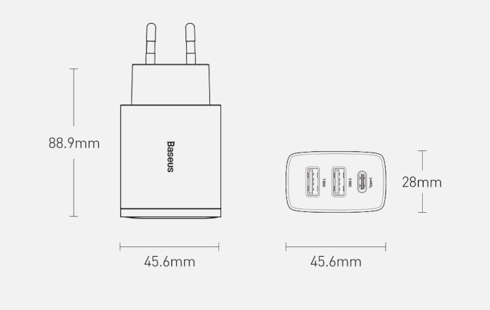 Ο Compact Quick Charger 30W της Baseus φαίνεται σχεδόν δυσδιάκριτος από εκείνους τους φορτιστές που έρχονται σε ένα κουτί smartphone. Έχει διαστάσεις 88.9 x 45.6 x 28 χιλιοστά και ζυγίζει μόλις 53 γραμμάρια. Μόνο που δεν διαθέτει μία υποδοχή εξόδου, αλλά τρεις: δύο USB και μία USB Type-C.