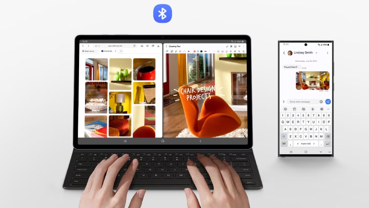 Με το Wireless Keyboard Sharing, μπορείς εύκολα να συνδεθείς στις άλλες σου συμβατές Galaxy συσκευές και να πληκτρολογήσεις ή να περιηγηθείς σε αυτές. Κάνε εναλλαγή μεταξύ συμβατών συσκευών με ευκολία και απόκτησε τον έλεγχο του συμβατού Galaxy smartphone σου, όπως ακριβώς θα έκανες και στο συμβατό Galaxy tablet σου.