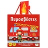 Ανακαλύψτε μέσα σε αυτό το κουτί ένα βιβλιαράκι με πληροφορίες για τον εξοπλισμό, το πυροσβεστικό όχημα και τις εγκαταστάσεις της πυροσβεστικής και συνδέστε τη λέξη του κάθε στοιχείου με τη σωστή εικόνα για να ενισχύσετε την πρώιμη αναγνωστική ικανότητα του παιδιού. Στη συνέχεια συναρμολογήστε το παζλ και το πυροσβεστικό και τοποθετήστε επάνω τις 4 φιγούρες ή παίξτε χωριστά με αυτές και σώστε την πόλη!