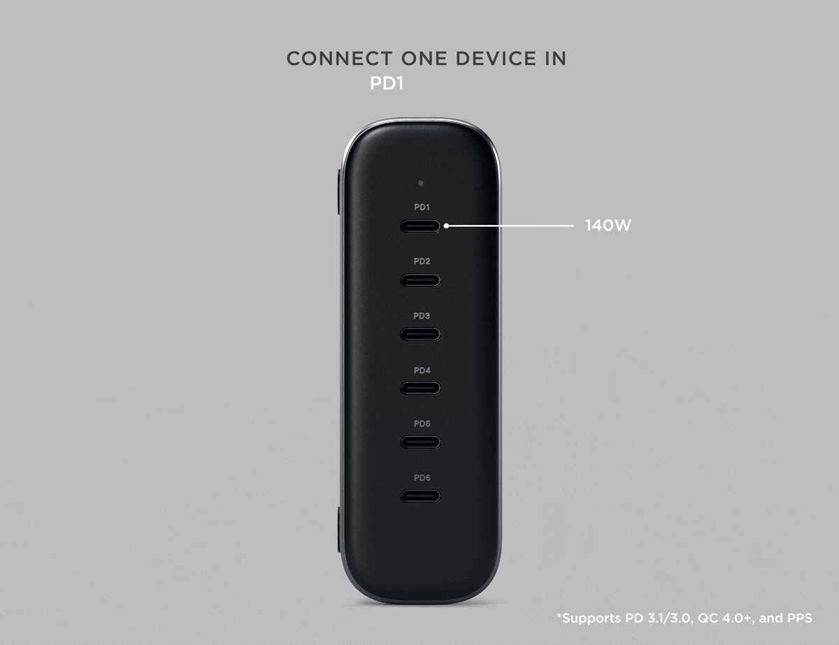 Συνδέστε μία συσκευή σε PD1 ή PD2 στα 140W ή συνδέστε και τις έξι θύρες στα 65W/45W/20W/20W/20W/20W.