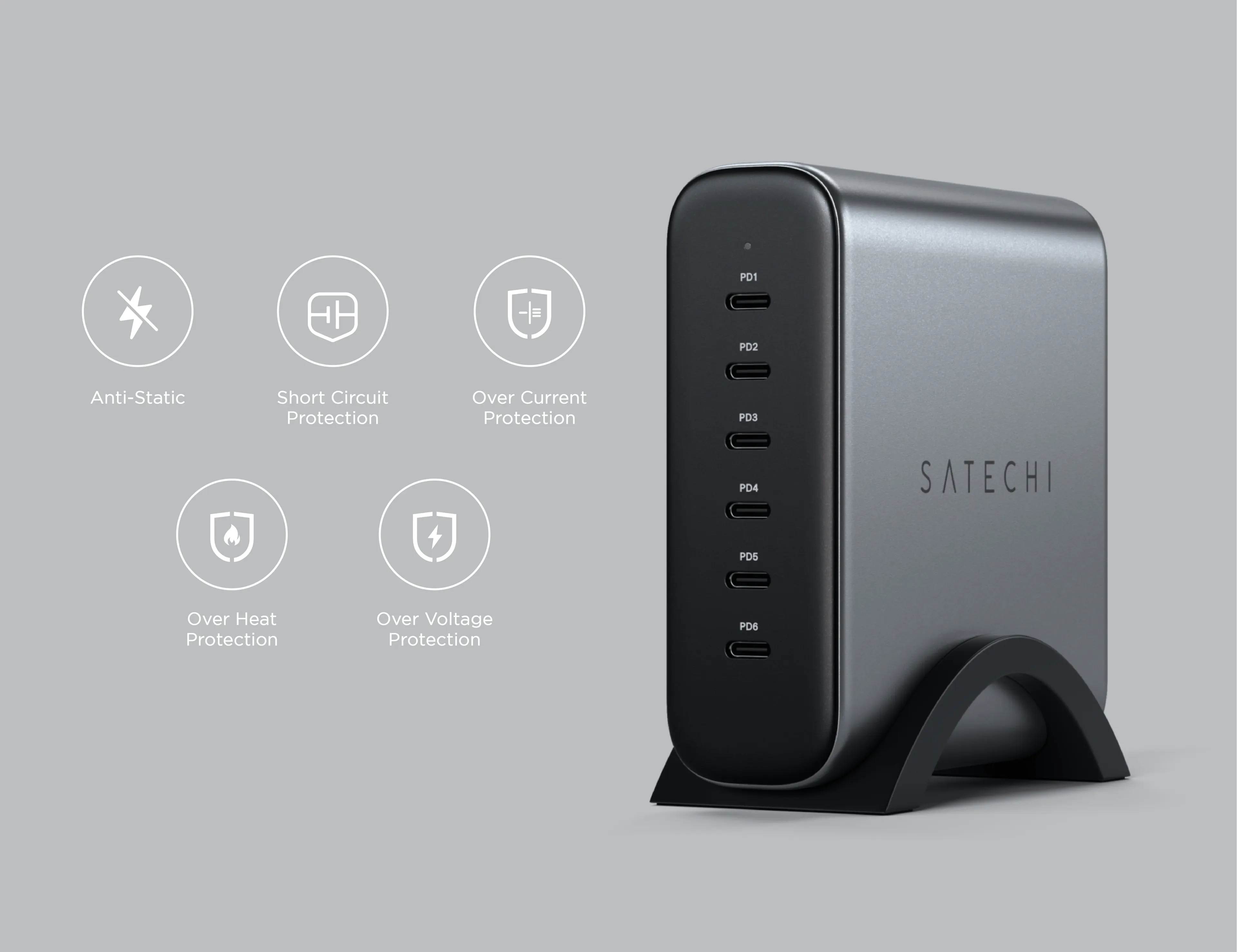 Ανεβάστε τη φόρτιση των συσκευών σας στο επόμενο επίπεδο με τον φορτιστή Satechi 200W USB-C 6-Port PD GaN, που διαθέτει τεχνολογία νιτριδίου του γαλλίου (GaN) για την τροφοδοσία έως και 6 συσκευών ταυτόχρονα. Εξοπλισμένος με 6 θύρες USB-C PD για υποστήριξη πολλαπλών διαμορφώσεων ισχύος έως και 200 W, ο φορτιστής 200 W USB-C 6 θυρών PD GaN μπορεί να τροφοδοτήσει εύκολα πολλαπλές συσκευές ώστε να μπορείτε να συνεχίσετε να εργάζεστε ενώ οι συσκευές σας φορτίζονται.