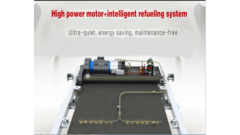 Μέσω μιας αυτόματης και αξιόπιστης διαδικασίας, ο μηχανισμός λίπανσης του διαδρόμου εφαρμόζει ακριβώς την απαιτούμενη ποσότητα λιπαντικού στον τάπητα κάθε 5 χιλιόμετρα χρήσης. Με αυτόν τον τρόπο, αποφεύγεται η σπατάλη λιπαντικού, διατηρείται ο διάδρομος και το περιβάλλον του καθαρό, ενώ μας δίνει την αίσθηση της ασφάλειας, καθώς δεν απαιτείται άλλη συντήρηση εκτός από την αναπλήρωση της δεξαμενής λιπαντικού (90 ml) περίπου κάθε τρεις μήνες με τη συνήθη χρήση.