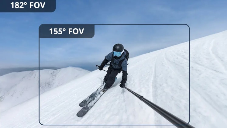 Όταν συνδέεται με τον φακό Osmo Action 6 FOV Boost, η κάμερα μεταβαίνει αυτόματα στη λειτουργία FOV Boost, επεκτείνοντας το εγγενές FOV 155° σε 182°. Ιδανικό για να βάλεις ολόκληρο το snowboard ή το τιμόνι σου στο κάδρο, για πραγματικά καθηλωτικές λήψεις POV από άκρη σε άκρη.