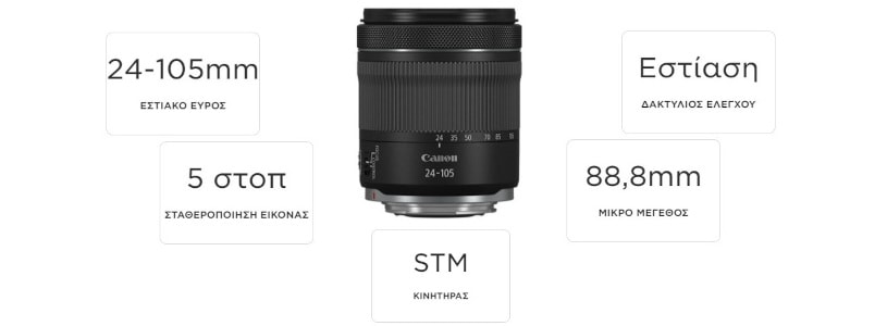 Απολαύστε όλα τα πλεονεκτήματα που προσφέρει η σειρά EOS R πλήρους καρέ με έναν ευέλικτο φακό 24-105mm για κάθε χρήση με ενσωματωμένο οπτικό σύστημα σταθεροποίησης εικόνας που εξασφαλίζει σταθερότητα για τις εικόνες και τα βίντεό σας.