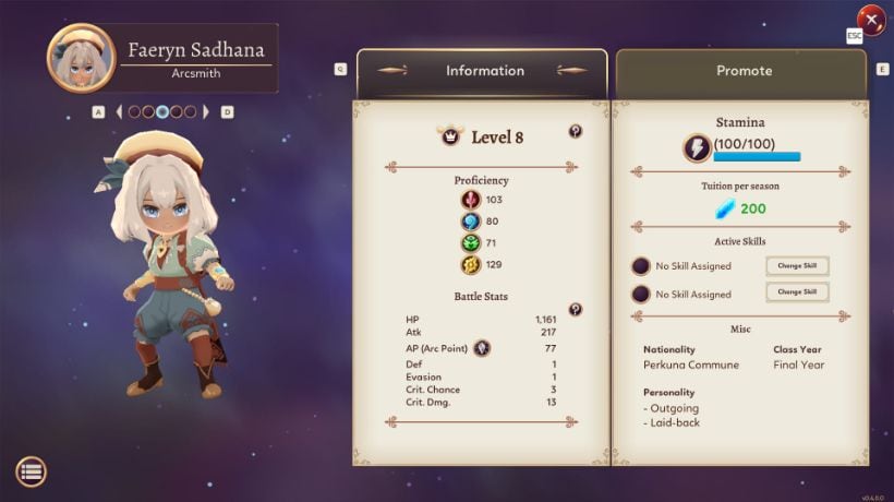 Λάβετε υπόψη το δυναμικό των μαθητών σας, είτε αυτό είναι δύναμη, μαγεία, θεϊκές ικανότητες ή προτίμηση στην τοξοβολία. Διαχειριστείτε το χρόνο τους και ενδυναμώστε τους ώστε να γίνουν δίκαιοι προστάτες της Valthiria. Η καθοδήγησή σας θα επηρεάσει την ικανότητά τους να εκτελούν αποστολές. Γι' αυτό αφιερώστε χρόνο και πάρτε αποφάσεις με σύνεση!