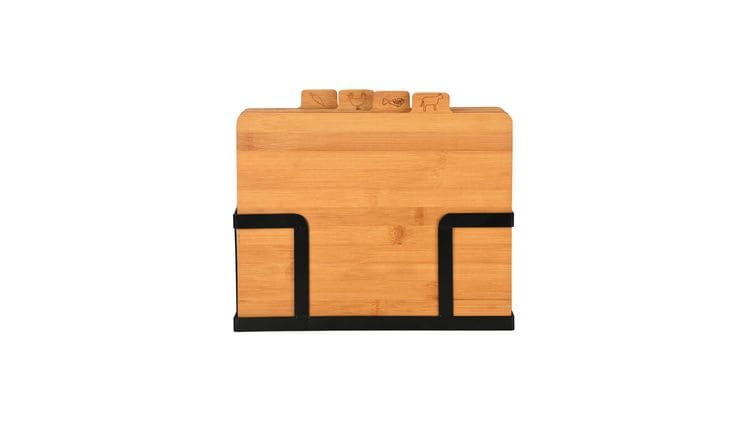 Το σετ περιλαμβάνει ξύλα κοπής από bamboo με μεταλλική βάση, προσφέροντας ανθεκτικότητα, υγιεινή και πρακτική αποθήκευση σε μία κομψή λύση.