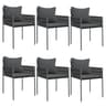 Καρέκλες κήπου σε μαύρο χρώμα για να απολαύσεις στιγμές χαλάρωσης. Περιλαμβάνει 6 καρέκλες από ρατάν πολυαιθυλενίου με ατσάλινο σκελετό, 6 υφασμάτινα μαξιλάρια πλάτης με γέμισμα βαμβάκι PP και 6 καθίσματος με γέμισμα αφρό. Διαθέτει μέγιστο φορτίο αντοχής 110kg.