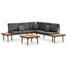 Αυτό το σετ καναπέ κήπου 4 τεμαχίων, θα αποτελέσει μια ιδανική προσθήκη στον εξωτερικό χώρο σας. Με τον διακριτικό και κομψό σχεδιασμό του θα προσθέσει μια πινελιά μοντέρνας φινέτσας στη βεράντα, το μπαλκόνι ή τον κήπο σας. Το σετ επίπλων κήπου μας καθαρίζεται εύκολα και δε φθείρεται, ενώ είναι κατασκευασμένο από μασίφ ξύλο ακακίας, ένα τροπικό σκληρό ξύλο, το οποίο διαθέτει αντίσταση στα καιρικά φαινόμενα και είναι ανθεκτικό για μακροχρόνια χρήση. Ο στιβαρός ατσάλινος σκελετός καθιστά το σετ πολύ σταθερό και ανθεκτικό. Μπορείτε επίσης να τοποθετήσετε μερικά σνακ, ποτά, κούπες, βιβλία ή άλλα μικροαντικείμενα στα μικρά ξύλινα τμήματα. Αυτό το σετ παραδίδεται με πολύ άνετα, πλούσια μαξιλάρια καθίσματος και πλάτης. Τα καλύμματα πολυεστέρα δεν απαιτούν πολλή συντήρηση και μπορούν επίσης να αφαιρεθούν και να πλυθούν. Αυτό το σαλόνι κήπου συναρμολογείται εύκολα.