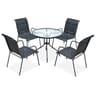 Αυτό το κομψό σετ επίπλων κήπου θα μετατραπεί στο επίκεντρο του κήπου, της βεράντας ή της τραπεζαρίας σας. Οι αναπαυτικές καρέκλες είναι κατασκευασμένες από υψηλής ποιότητας χάλυβα με ηλεκτροστατική βαφή πούδρας. Χάρις στο ισχυρό ύφασμα textilene με αδιάβροχη επένδυση, οι καρέκλες μας είναι πολύ αναπαυτικές, αντιστέκονται στις καιρικές συνθήκες και καθαρίζονται εύκολα, ενώ μπορούν να στοιβαχτούν προς εξοικονόμηση χώρου. Το τραπέζι διαθέτει επιφάνεια από ψημένο γυαλί με σχέδιο πτυχώσεων πάχους 5 χιλ., στην οποία μπορείτε να τοποθετείτε ποτά, σνακ ή διακοσμητικά. Διαθέτει επίσης στιβαρό και ανθεκτικό σκελετό από χάλυβα με ηλεκτροστατική βαφή πούδρας που συντηρείται εύκολα. Με τις κεντρικές οπές για ομπρέλα στην επιφάνεια και το κάτω μέρος, μπορείτε να τοποθετήσετε εύκολα ένα μεγάλο σκίαστρο που θα προσφέρει σκιά τις ζεστές μέρες του καλοκαιριού. Η συναρμολόγηση είναι εύκολη. Στην παράδοση περιλαμβάνονται 1 τραπέζι και 4 καρέκλες από ύφασμα textilene. Σημείωση: Συνιστούμε να καλύπτετε το σετ κατά τη διάρκεια της βροχής, του χιονιού και του παγετού.