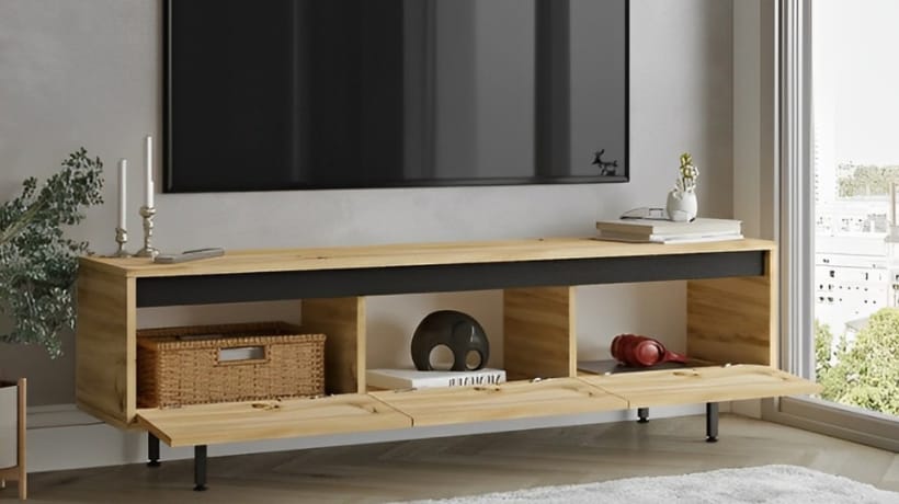 Η κατασκευή του επίπλου τηλεόρασης σου προσφέρει την επιλογή να το τοποθετήσεις με ευκολία στον τοίχο σου, δημιουργώντας ένα εντυπωσιακό και λειτουργικό σημείο εστίασης. Με τα πολυάριθμα ράφια που διαθέτει μπορείς να οργανώσεις τα αγαπημένα σου αντικείμενα με άνεση, κρατώντας τα τακτοποιημένα και πάντα προσβάσιμα.
