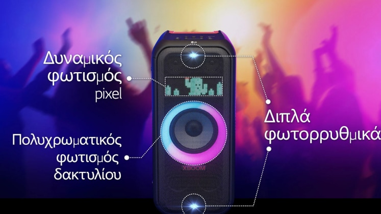 Ο φωτισμός πάρτι του LG XBOOM "ανάβουν" το πάρτι. Μπορείτε να δημιουργήσετε ένα σόου με φώτα για πάρτι, εκπλήσσοντας παράλληλα το κοινό σας με κείμενο ή κινούμενα σχέδια. Τα φανταχτερά διπλά φωτορρυθμικά θα αιχμαλωτίσουν το πλήθος.