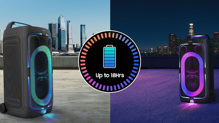 Απόλαυσε έως και 18 ώρες διασκέδασης με μία μόνο φόρτιση. Με μπαταρία μεγάλης διάρκειας, το Sound Tower σου προσφέρει εκπληκτικό ήχο — χωρίς να χρειάζονται καλώδια ρεύματος — με αρκετό ρεύμα για να συνεχιστεί το πάρτι.