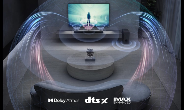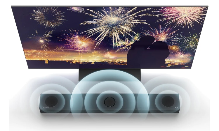 Σε πανοραμική άποψη, η τηλεόραση LG στέκεται στο δάπεδο και το LG Sound bar βρίσκεται ακριβώς κάτω από την τηλεόραση στον άπειρο χώρο. Στην οθόνη της τηλεόρασης, φαίνεται η σιλουέτα ενός ζευγαριού με φόντο πυροτεχνήματα. Γραφικά ηχητικών κυμάτων προέρχονται από το κεντρικό, το αριστερό και το δεξί ηχείο από την κορυφή του sound bar.