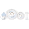 Παιδικό σετ φαγητού σε λευκό-σιέλ χρώμα και σχέδιο μαϊμού από την εταιρία Saro. Είναι κατασκευασμένα από πλαστικό υλικό, απαλλαγμένα από BPA. Το σετ περιλαμβάνει πιάτο, μπολ, κουτάλι, πιρούνι και ένα κύπελλο με λαβές κατά των διαρροών, για να μάθει το μικρό σας να τρώει μόνο του. Ιδανικό σετ που θα βοηθήσει το μικρό σας να νιώσει ανεξάρτητο. Κατάλληλο για ηλικίες 6+ μηνών.