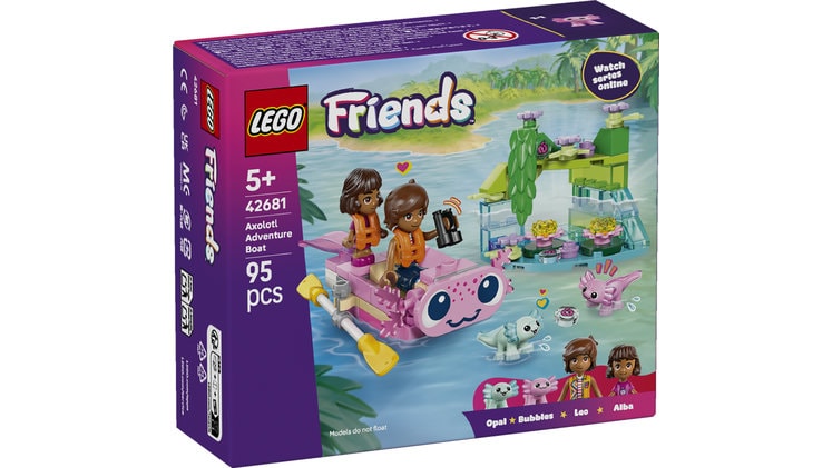 Πάμε να δούμε αξολότλ με τη LEGO® Friends Βάρκα-Αξολότλ για Περιπέτειες! Έλα με τον Λέο και την Άλμπα καθώς αναζητούν τα φιλικά πλάσματα. Η χαριτωμένη βάρκα έχει κουπιά και 2 σωσίβια και διαθέτει πρόσωπο αξολότλ και κουνιστή ουρά. Κοίτα! Εδώ είναι τα 2 γλυκά αξολότλ που παίζουν ανάμεσα στα φυτά και τα λουλούδια. Τι διασκεδαστική βόλτα με βάρκα!