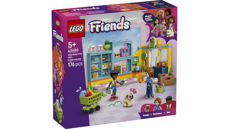 Πάμε για ψώνια! Το LEGO® Friends Παντοπωλείο της Χάρτλεϊκ Σίτυ έχει ό,τι χρειάζεσαι. Να κι ο σκύλος Ντάνγκο με την Ότομ και τον Ζακ. Διαλέγουν τα αγαπημένα τους τρόφιμα, όπως ντόνατς, φρούτα, χυμούς, καρότα, γάλα και άλλα και τα βάζουν στο καρότσι τους. Αφού πληρώσουν, πηγαίνουν στο σημείο ανακύκλωσης για να ανακυκλώσουν ένα άδειο μπουκάλι. Τι διασκεδαστική βόλτα για ψώνια!