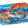 Στη θάλασσα, η ομάδα θαλάσσιας διάσωσης φροντίζει ανθρώπους που έχουν ανάγκη. Ο καπετάνιος του πλοίου διάσωσης μόλις λαμβάνει κλήση κινδύνου. Ένα ταχύπλοο έχει πιάσει φωτιά και η ζωή του οδηγού βρίσκεται σε κίνδυνο. Γρήγορα το πλήρωμα διάσωσης πηγαίνει στις συντεταγμένες που έχουν δοθεί. Όταν φτάνουν στο σημείο του ατυχήματος, ρίχνουν πρώτα έναν σωσίβιο στον οδηγό του ταχύπλοου και στη συνέχεια αρχίζουν να σβήνουν το φλεγόμενο όχημα. Ευτυχώς, η ομάδα διάσωσης είναι καλά εξοπλισμένη και έθεσε γρήγορα τη φωτιά υπό έλεγχο. Με το βαρούλκο το ταχύπλοο τραβιέται στο πλοίο διάσωσης και επαναφέρεται στο λιμάνι. Το σετ παιχνιδιού περιέχει τέσσερις φιγούρες PLAYMOBIL, ένα πλοίο διάσωσης, ένα ταχύπλοο, ένα drone, εξοπλισμό κολύμβησης με αναπνευστήρα και πολλά άλλα πρόσθετα για συναρπαστικές επιχειρήσεις διάσωσης στο παιδικό δωμάτιο.