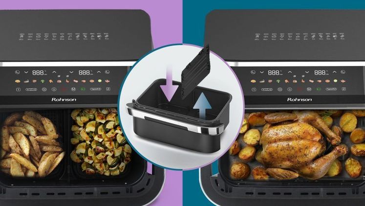 Η συσκευή σου δίνει την επιλογή για 2 διαφορετικά φαγητά ταυτόχρονα, χωρίζοντας τον κάδο σε δύο ξεχωριστούς κάδους 4.5L, αλλά μπορείτε να εκμεταλλευτείτε τον κάδο συνολικής χωρητικότητας 9L, όπου απολαμβάνεις άφθονο χώρο για να χωρέσετε εκείνα τα μεγαλύτερα φαγητά που συνήθως μαγειρεύεις στο φούρνο.