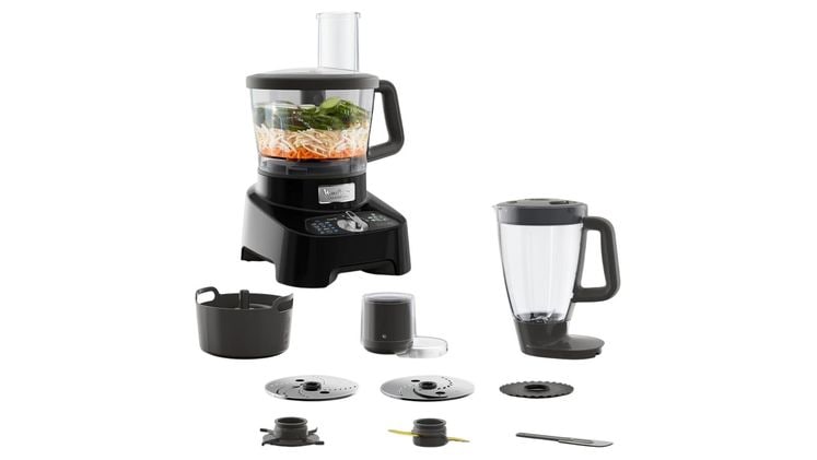 Διαθέτει μια μεγάλη ποικιλία ειδικά σχεδιασμένων, αποτελεσματικών εξαρτημάτων: ανοξείδωτη λεπίδα για να κόβεις και να τεμαχίζεις κάθε είδους υλικό, δύο ανοξείδωτους δίσκους διπλής όψης για να τρίβεις/τεμαχίζεις και να ψιλοτρίβεις/ψιλοκόβεις λαχανικά ή τυρί, κανάτα μπλέντερ για να αναμιγνύεις λαχταριστές σούπες, χυμούς, smoothies, κ.λπ., ζυμωτή για να φτιάχνεις κάθε είδους ζύμη από ελαφριά έως βαριά, τεμαχιστή για να ψιλοκόβεις κρεμμύδια, σκόρδα, μυρωδικά, κ.λπ., και δίσκο για να χτυπάς σαντιγί για γλυκά και σάλτσες όπως μαγιονέζα.