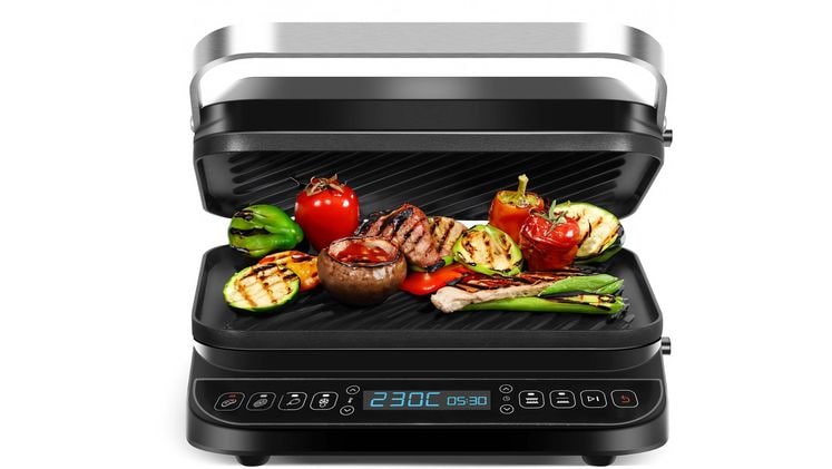 Έχει άνοιγμα 180°, θερμοκρασία έως 230°C και αποσπώμενες αντικολλητικές πλάκες κατάλληλες για πλυντήριο.
