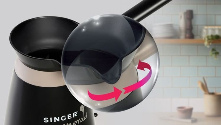 Hλεκτρικό μπρίκι της SINGER με καπάκι ασφαλείας για καφέ και βράσιμο νερού, με προστασία από υπερθέρμανση και περιστρεφόμενη βάση 360° για άνετη χρήση.
