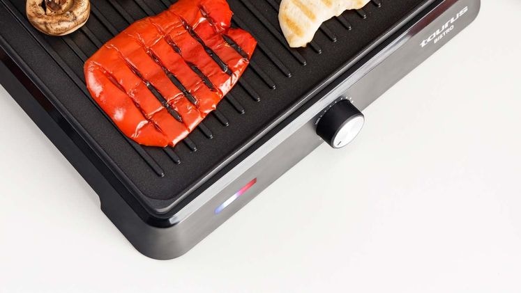 Ο ρυθμιζόμενος θερμοστάτης σου παρέχει απόλυτο έλεγχο της θερμοκρασίας, ενώ ο αφαιρούμενος δίσκος συλλογής λίπους και η αντικολλητική επίστρωση διευκολύνουν το καθάρισμα μετά το μαγείρεμα.