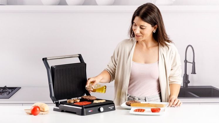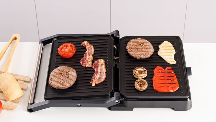 Με το πλήρες άνοιγμα 180°, μπορείς να τη χρησιμοποιήσεις είτε ως ανοιχτή πλάκα για κρέας, ψάρι και λαχανικά, είτε κλειστή για τοστ και σάντουιτς.