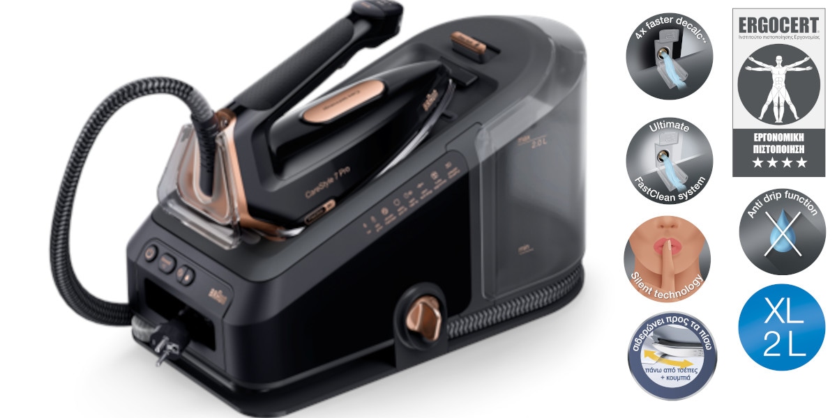 Το νέο care style 7 pro είναι το πιο ισχυρό σύστημα σιδερώματος, παρέχοντας έως και 190 g/min συνεχούς παραγωγής ατμού χάρη στην πρωτοποριακή τεχνολογία powers team. Ανακάλυψε ένα νέο επίπεδο ποιότητας σιδερώματος και πρωτοποριακά χαρακτηριστικά που σου επιτρέπουν να κερδίσεις εύκολα και γρήγορα τον αγώνα ενάντια στα πιο σκληρά υφάσματα και τις επίμονες ζάρες. Μπορείς να πετύχεις επαγγελματικά αποτελέσματα σιδερώματος με άνεση και ευκολία, χάρη στην ειδική εργονομική σχεδίαση λαβής του πρώτου πιστοποιημένου εργονομικού σίδερου στον κόσμο.