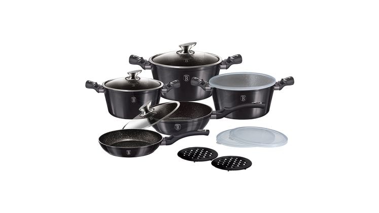 Το BERLINGER HAUS BH-6886 Carbon Pro είναι ένα σετ 13 μαγειρικών σκευών που συνδυάζει κομψό design, ανθεκτική κατασκευή από χυτό αλουμίνιο και μαρμάρινη αντικολλητική επίστρωση 3 στρώσεων.