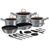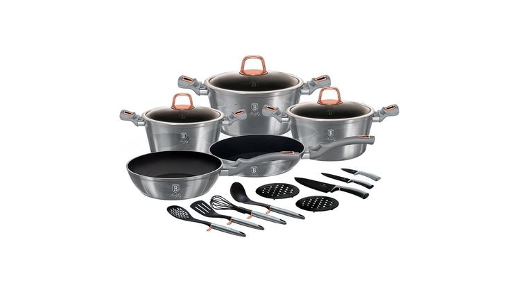 3 Κατσαρόλες με καπάκια, 2 Τηγάνια, 4 Μαχαίρια, 4 Κουτάλες/εργαλεία (σπάτουλα, κουτάλα, αφαιρούμενος αφρός, αυγοδάρτης), 1 Σουρωτήρι