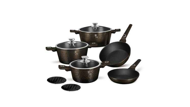 3 κατσαρόλες με καπάκι, 2 τηγάνια, 2 βάσεις από βακελίτη