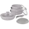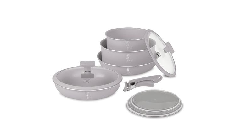 2 τηγάνια, 1 σάλτσαρα, 1 κατσαρόλα, 2 καπάκια με σουρωτήρι, 2 καπάκια universal, 1 αφαιρούμενη λαβή