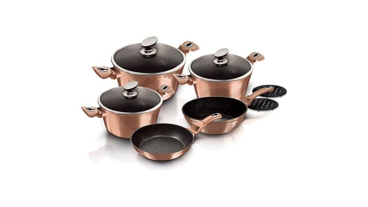 Αντικολλητική επίστρωση μαρμάρου 3 στρώσεων, Εργονομικές λαβές soft-touch, Καπάκια από γυαλί με inox λαβή και στεφάνι, Turbo Induction πάτος, Θερμοανθεκτικά σουβέρ, Χωρίς PFOA, Μόλυβδο και Κάδμιο