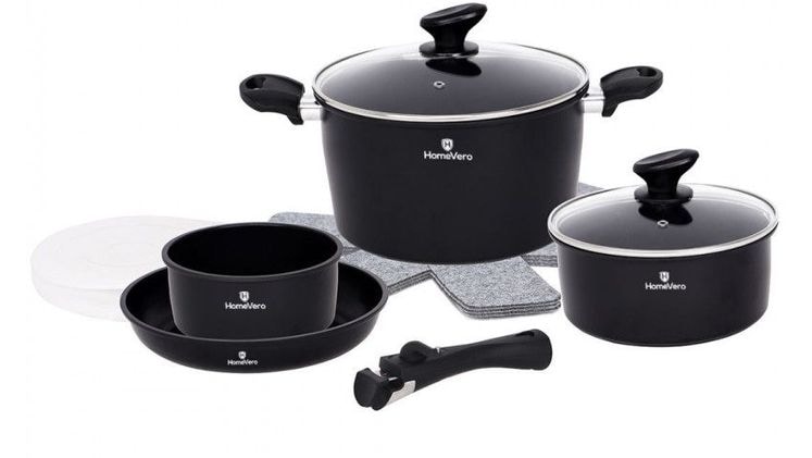 Το σετ περιλαμβάνει κατσαρόλες, τηγάνι, αποσπώμενο χερούλι, καπάκια και προστατευτικά επιφάνειας, εξοικονομώντας έως και 50% χώρο.