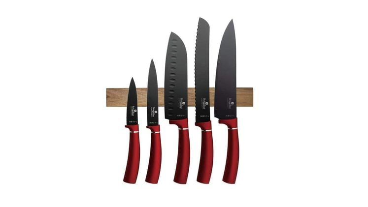 Περιλαμβάνει 5 μαχαίρια με εργονομική λαβή soft-touch και μαγνητική βάση τοίχου από ξύλο ακακίας, προσφέροντας υγιεινή, οργάνωση και κοπή υψηλής ακρίβειας.