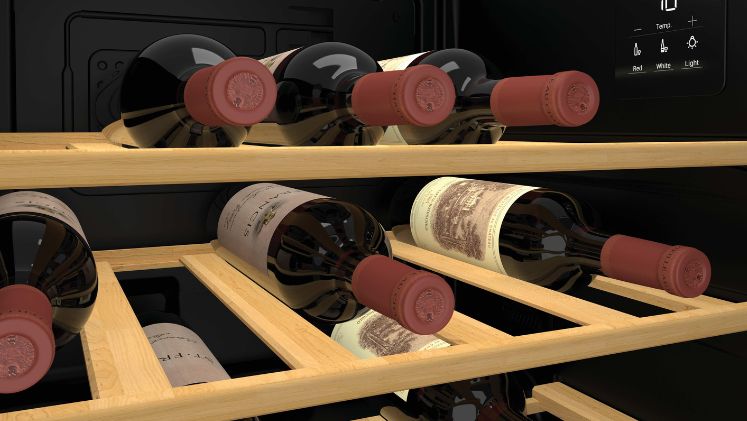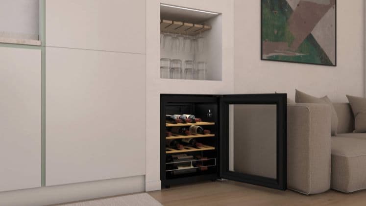 Ταυτόχρονα, διαθέτει κομψή αισθητική με φωτισμό LED και ξύλινα ράφια ομορφαίνοντας τον χώρο, αναδεικνύοντας την κάβα σου. Παράλληλα, Για να χωράει σε όλες τις διατάξεις κουζίνας, υπάρχει η δυνατότητα αντιστροφής φοράς της πόρτας.