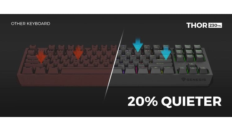 Το Genesis Thor 230 TKL διαθέτει ειδικό αφρό σίγασης μεταξύ της πλακέτας PCB και της βάσης, μειώνοντας τον θόρυβο των πληκτρολογήσεων έως και 20%. Μαζί με την επιπλέον ηχομόνωση στο spacebar, απολαμβάνεις ήσυχο gaming ακόμα και στις πιο έντονες στιγμές. Ο μη αιωρούμενος σχεδιασμός του εγγυάται μέγιστη σταθερότητα στα πλήκτρα, προσφέροντάς σου μεγαλύτερη ακρίβεια και ελαχιστοποιώντας τον κίνδυνο λάθους κατά τη διάρκεια του γρήγορου παιχνιδιού.