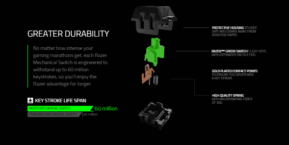 Τα Μηχανικά Πλήκτρα της Razer είναι έτσι σχεδιασμένα ώστε να μην υπάρχουν καθόλου ταλαντώσεις και τριβές στους άξονες και τα πλήκτρα να αντέχουν τουλάχιστον 60 εκατομμύρια ενεργοποιήσεις το καθένα! Μετά από ενδελεχή έρευνα οι πολυβραβευμένοι μηχανικοί της Razer όρισαν την τέλεια απόσταση ενεργοποίησης για το απόλυτο gaming μηχανικό πλήκτρο!
