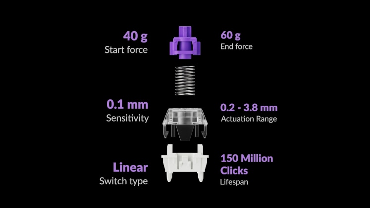 Με την πρώτη κατασκευή dual-rail που εφευρέθηκε και την ειδική προ-λίπανση, αυτοί οι διακόπτες εξασφαλίζουν απαράμιλλη σταθερότητα και ομαλότητα όπως ποτέ άλλοτε. Εγκατεστημένο με έναν βέλτιστο μαγνητικό αισθητήρα με ευαισθησία μόνο 0,1 mm, προσφέρει πιο πολύτιμη ανατροφοδότηση. Μπορείς να προσαρμόσεις τα σημεία ενεργοποίησης και να εκχωρήσεις πολλαπλές ενέργειες σε ένα μόνο κλειδί με βάση το βάθος ταξιδιού που εξατομίκευσες, βελτιώνοντας το παιχνίδι και παρέχοντας μια προσαρμοσμένη αίσθηση πληκτρολόγησης.