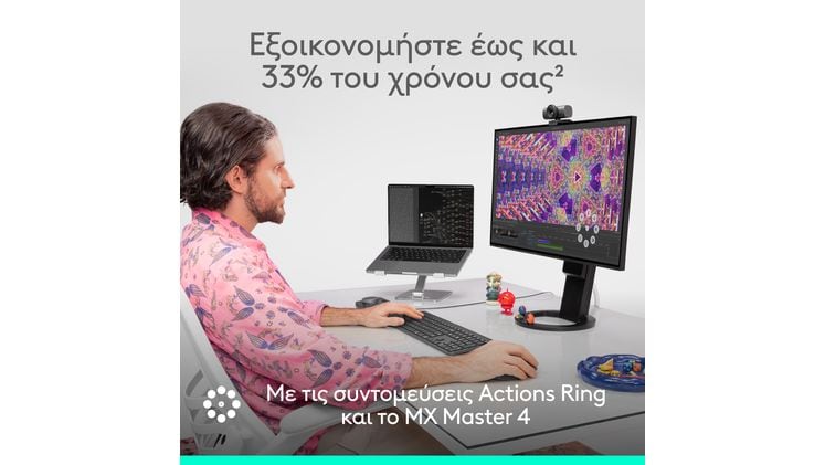 Με το Actions Ring στο MX Master 4, μπορείς να εξοικονομήσεις έως και 33% του χρόνου σου. Η δυναμική επικάλυψη προσαρμόζεται σε κάθε εφαρμογή, τοποθετώντας τα πιο χρησιμοποιημένα φίλτρα και ρυθμίσεις στον δρομέα σου. Αυτό βελτιστοποιεί τη ροή εργασίας και ενισχύει την αποδοτικότητα σου.