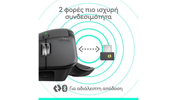 Το MX Master 4 προσφέρει 2 φορές πιο ισχυρή συνδεσιμότητα με το dongle USB-C Logi Bolt. Διαθέτει ένα προηγμένο τσιπ ασύρματης επικοινωνίας και βελτιστοποιημένη κεραία για ταχύτερη, ισχυρότερη και πιο αξιόπιστη απόδοση. Μπορείς επίσης να χρησιμοποιήσεις το Bluetooth για μεγαλύτερη ευελιξία.
