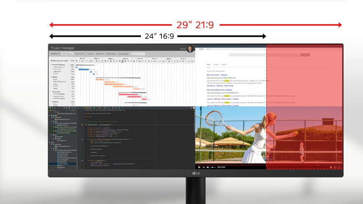 Η οθόνη UltraWide™ Full HD (2560×1080) προσφέρει 33% περισσότερο οριζόντιο χώρο οθόνης από μια τυπική οθόνη FHD (1920×1080). Ο σχεδιασμός σχεδόν χωρίς πλαίσιο προσφέρει μια αδιάλειπτη, ευρύτερη προβολή. Αυτό επιτρέπει πιο αποτελεσματική εκτέλεση πολλαπλών εργασιών χωρίς εναλλαγή μεταξύ παραθύρων.