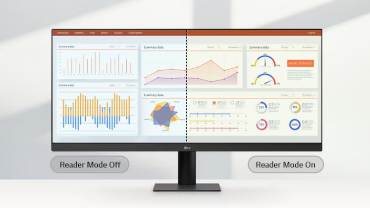 Η Λειτουργία ανάγνωσης ρυθμίζει τη θερμοκρασία και τη φωτεινότητα των χρωμάτων για να βοηθήσει στη μείωση της κόπωσης των ματιών κατά την προβολή εγγράφων για μεγάλα χρονικά διαστήματα. Η εξαιρετικά ευρεία οθόνη LG εμφανίζει μια σύγκριση μεταξύ των επιλογών Λειτουργία ανάγνωσης Απενεργοποίηση και Ενεργοποίηση, με το δεξί μισό να εμφανίζει θερμότερους τόνους και μειωμένο μπλε φως για άνετη προβολή. Το Flicker Safe μειώνει το αόρατο τρεμόπαιγμα στην οθόνη και παρέχει ένα πιο άνετο εργασιακό περιβάλλον για τα μάτια σας.