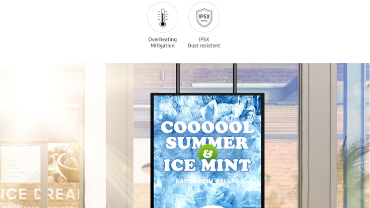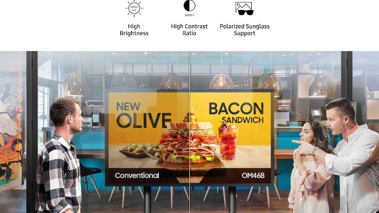 Η Samsung OMB είναι επαγγελματική οθόνη βιτρίνας 46" με VA panel, ανάλυση 1.920x1.080 και φωτεινότητα 4.000 nit. Υποστηρίζει λειτουργία 24/7, έχει λόγο αντίθεσης 6.000:1, χρόνο απόκρισης 6ms και γωνία θέασης 178°. Διαθέτει Tizen 5.0 OS, ενσωματωμένο media player με MagicINFO S, Wi-Fi και 8GB flash μνήμη. Με προστασία IP5X για αντοχή σε σκόνη και θερμότητα. Ιδανική για εφαρμογές ψηφιακής σήμανσης σε βιτρίνες υψηλής φωτεινότητας.