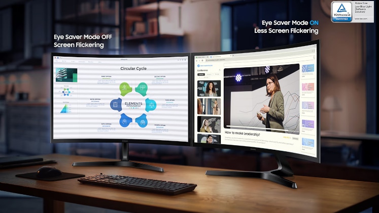 Η Samsung Essential Monitor S3 είναι σχεδιασμένη για την υγεία των ματιών σου. Η λειτουργία Eye Saver Mode μειώνει τις εκπομπές μπλε φωτός που προκαλούν κόπωση, ενώ η τεχνολογία Flicker Free εξαλείφει το ενοχλητικό τρεμόπαιγμα της οθόνης. Αυτοί οι συνδυασμοί εξασφαλίζουν μια άνετη και ξεκούραστη εμπειρία θέασης, ακόμα και μετά από πολλές ώρες χρήσης, προστατεύοντας τα μάτια σου από την καταπόνηση.