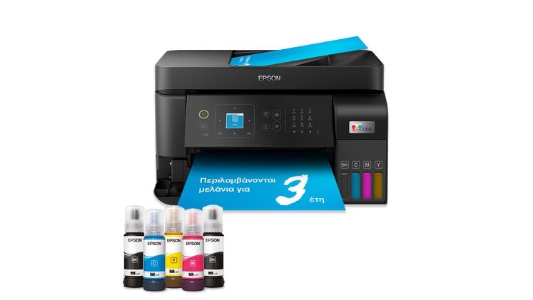 Ιδανικός για οικιακά περιβάλλοντα και μικρά γραφεία με συχνές ανάγκες εκτύπωσης, αυτός ο εκτυπωτής inkjet A4 διαθέτει επαναγεμιζόμενα δοχεία μελανιού και μελάνια καλύπτουν τις ανάγκες σας για έως 3 έτη, που συμπεριλαμβάνονται στη συσκευασία* για εξαιρετικά χαμηλό κόστος εκτύπωσης ανά σελίδα. Οι οικιακές λειτουργίες περιλαμβάνουν Wi-Fi, Wi-Fi Direct, σάρωση και αντιγραφή. Στα επιπλέον επαγγελματικά χαρακτηριστικά περιλαμβάνονται το Ethernet, ο αυτόματος τροφοδότης εγγράφων 30 σελίδων και το φαξ!