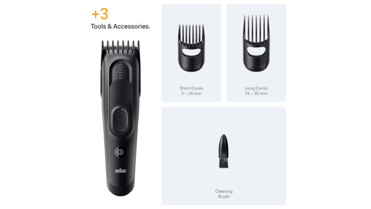 Η συσκευή περιποίησης περιλαμβάνει όλα τα βασικά για εύκολο κούρεμα στο σπίτι: Χτένα για κοντά μαλλιά 3–24 mm,Βουρτσάκι καθαρισμού και Τροφοδοτικό ρεύματος.