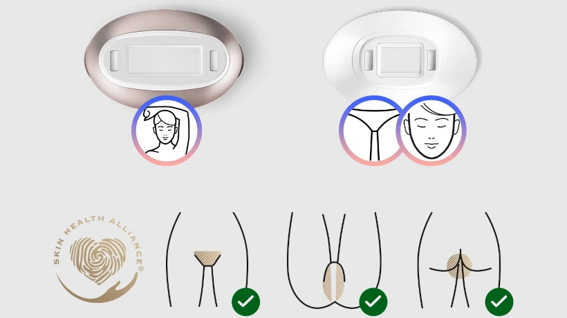 Η IPL αποτριχωτική συνοδεύεται από κεφαλή ακριβείας για μικρότερες, ευαίσθητες περιοχές όπως το πρόσωπο και οι ηβικές περιοχές (συμπεριλαμβανομένης της ηβικής ηβίας, των μεγάλων χειλέων, του περίνεου και γύρω από τον πρωκτό), και από μια τυπική κεφαλή για τις μασχάλες, τα πόδια και άλλες μεγάλες περιοχές του σώματος.