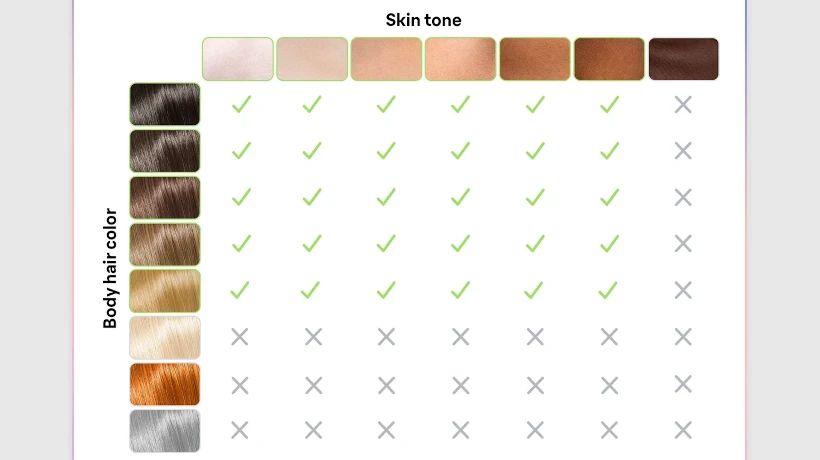 Το Braun IPL είναι κατάλληλο για ένα ευρύ φάσμα αποχρώσεων δέρματος από ανοιχτό έως μεσαίο σκούρο δέρμα, με τρίχες που κυμαίνονται από φυσικό ξανθό έως σκούρο καφέ ή μαύρο. Η τεχνολογία IPL είναι λιγότερο κατάλληλη σε πολύ ξανθά, κόκκινα, γκρίζα ή λευκά μαλλιά όπου υπάρχει λιγότερη μελανίνη για να απορροφήσει το φως.
